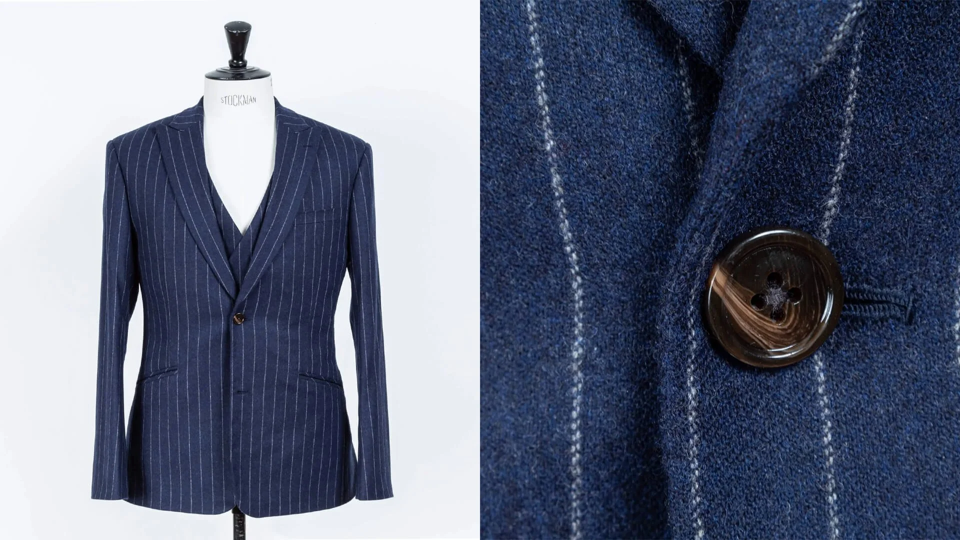 The slanted welt pockets add a touch of casual elegance, and the warm brown buttons provide subtle contrast against the deep blue chalk stripe fabric. Handmade working buttonholes reflect the tailored sophistication characteristic of the 1910-1930 period.